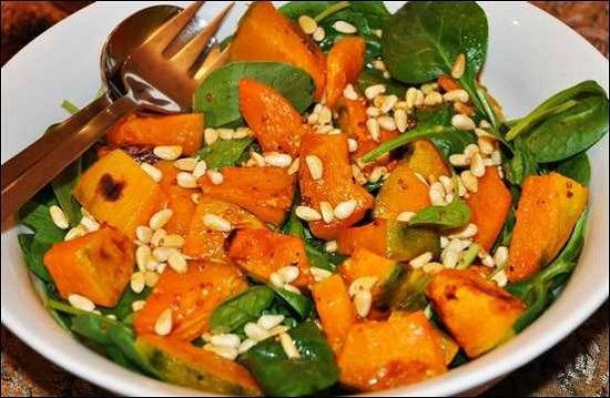 Salad bí đỏ là món ăn thanh mát, dễ làm. Bạn có thể dùng bí đỏ nướng hoặc luộc, sau đó trộn cùng với rau sống, hạt hướng dương, và một ít sốt dầu giấm.