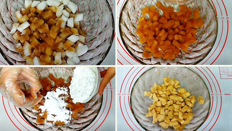 Đảo cùi bưởi với bột năng sao cho mỗi miếng cùi đều phủ đều bột.