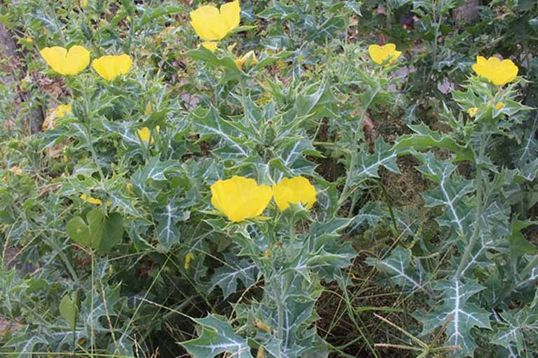 Hình Dáng: Cây thân thảo, có thể cao tới 1 mét, lá có gai, hoa màu vàng.